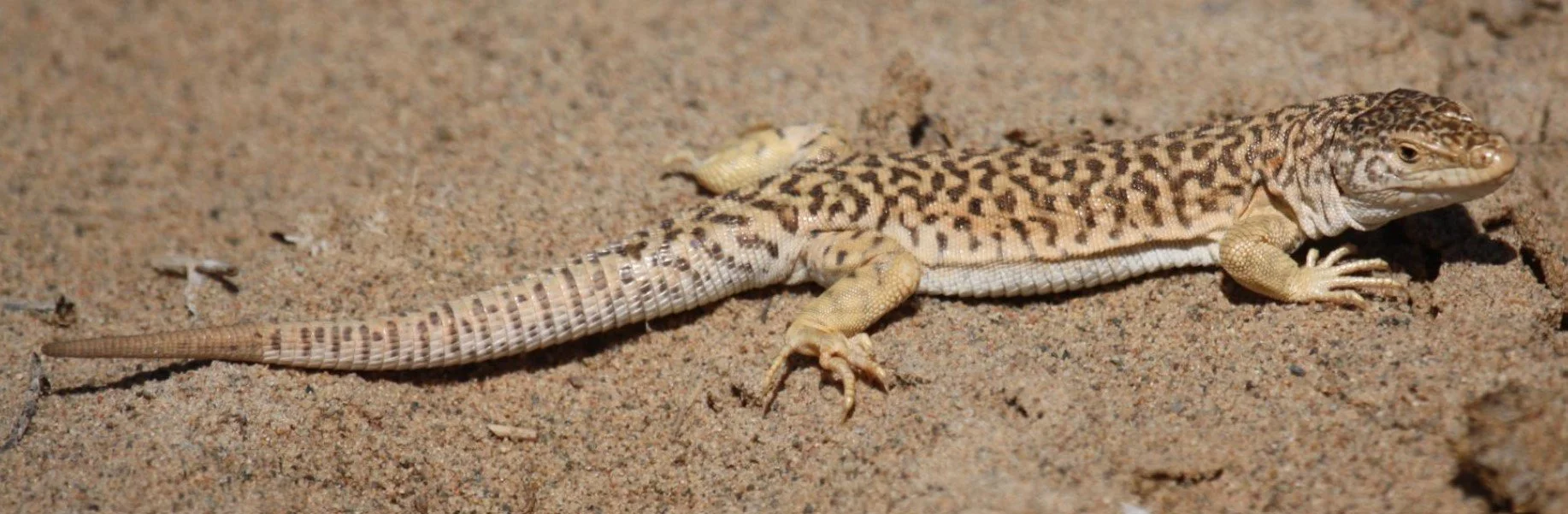 Given the short lifespan of the Rapid fringe-toed lizard, I’m also surprised to find that it apparently only produces 2-5 eggs per year: you’d expect greater fecundity in such a small, short-lived animal. Juvenile racerunners often differ substantially from adults in colouration. This is a fairly common thing for lacertids and might be an evolutionary response to the different predation pressures that affect these animals at different points in their lives. Minor sexual dimorphism is present, with males having proportionally larger heads than females (Li et al. 2006) and, in some species, more prominent spots and stripes (Moravec 1994). However, the heads of males are apparently no broader than those of females (though they are longer) in Mongolian racerunners or Ordos racerunners E. brenchleyi, perhaps because head width is constrained in those species by its role in sand-burrowing, nor are males larger or longer overall (Kim et al. 2010).