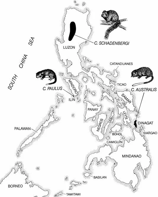 What does this distribution tell us about cloud rat history in the Philippines? The fact that most species occur in the northern part of the archipelago suggests that they moved into the area from the north, an idea consistent with other evidence (Musser & Heaney 1992). We’ll come back to this subject in a moment. Note also that the Dinagat species is the only cloud rat from the southern Philippines. Incidentally, a few other new mammals were discovered on the same 1975 expedition that led to the technical recognition of the Dinagat species, namely the Dinagat moonrat Podogymnura aureospinula and Dinagat hairy-tailed rat Batomys russatus.