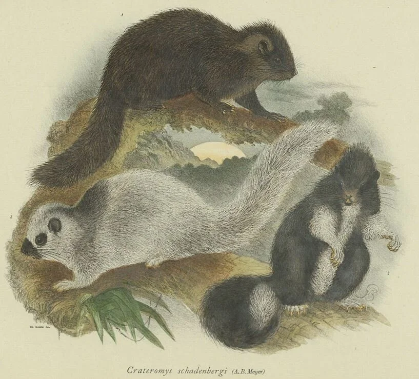 Caption: colour variation within the luxuriantly furred Bushy-tailed cloudrunner, Giant bushy-tailed cloudrunner or Luzon bushy-tailed cloud rat Crateromys schadenbergi. Image: Adolph Bernhard Meyer, public domain.