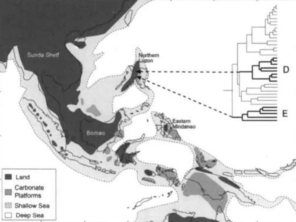 Caption: Jansa et al. (2006) found northern Luzon to be the place where ‘Old Endemic’ Philippine murids (‘E’ in the cladogram) have their centre of distribution. At the time shown in this map (about 15 million years ago), the northern Philippines were separated from the southern islands by deepwater channels, so migration to that southern section likely happened later on. Image: Jansa et al. (2006).