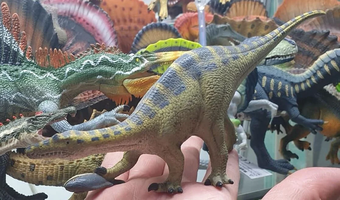 Caption: the notion of the quadrupedal Baryonyx has mostly died out today, since we now know that the robust upper arm bones of baryonychines and other spinosaurids likely weren’t used in weight support. I don’t know what role Angela Milner had in the look of the Invicta Baryonyx figure - shown here - but its quadrupedal pose might be a holdover from the view Charig and Milner favoured during the mid-1980s. Image: Darren Naish.