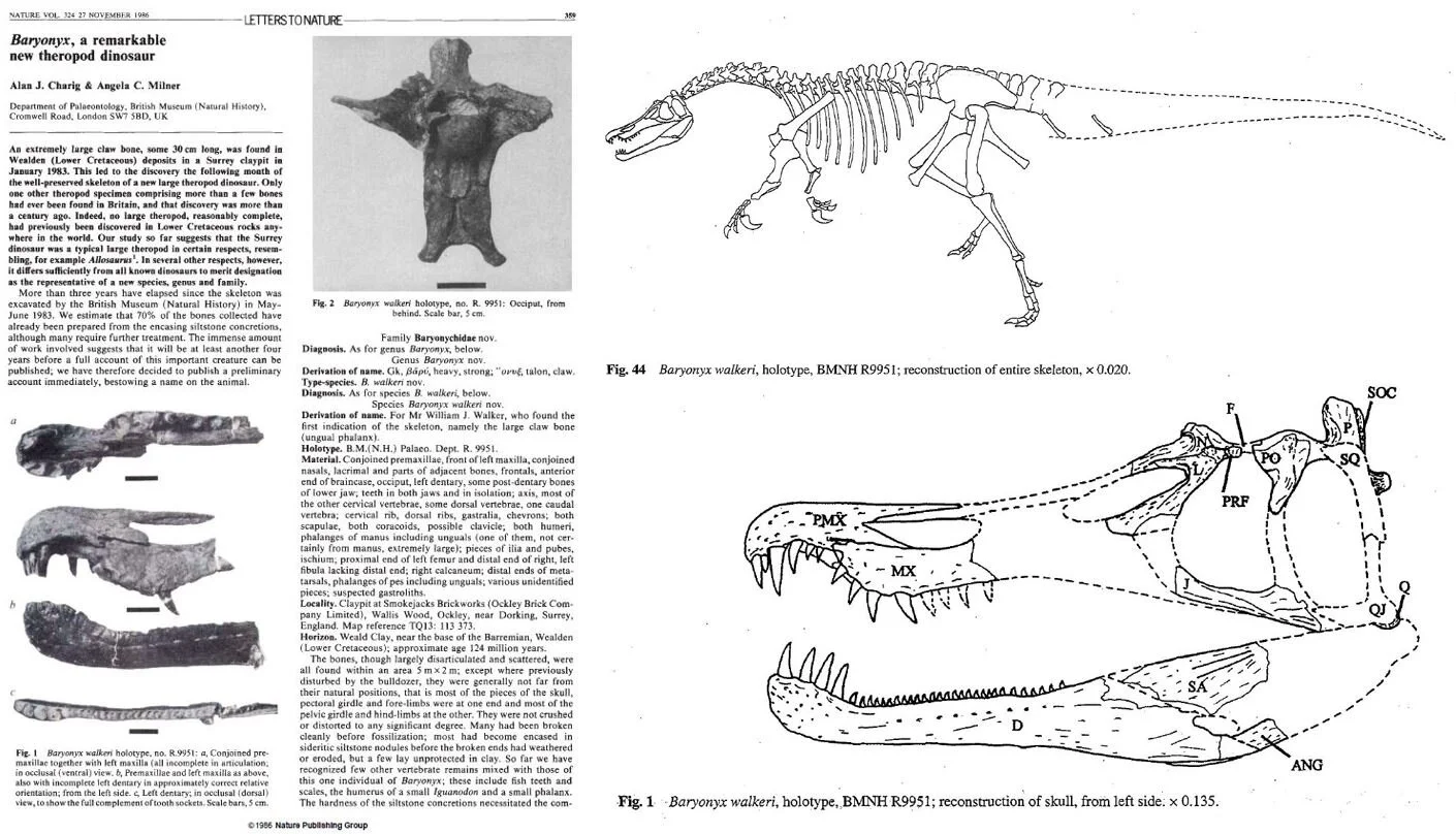 Charig, A. J. & Milner, A. C. 1997. Baryonyx walkeri, a fish-eating dinosaur from the Wealden of Surrey. Bulletin of the Natural History Museum 53, 11-70.