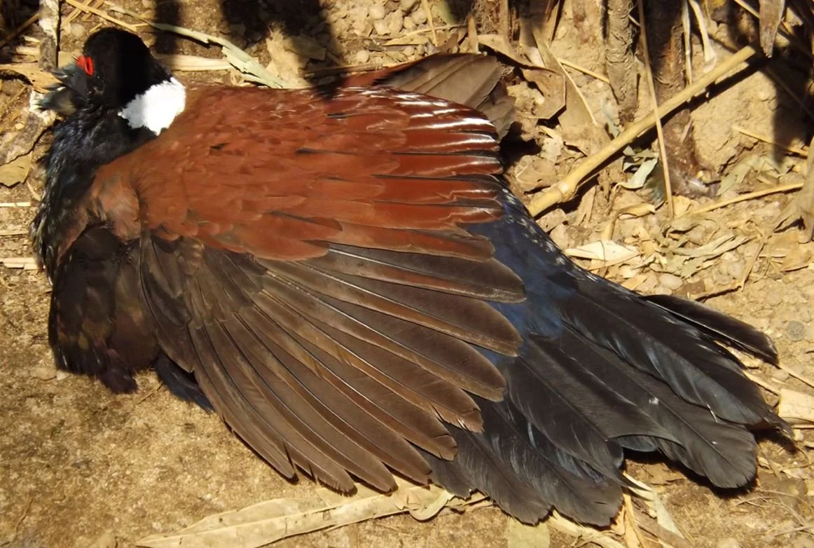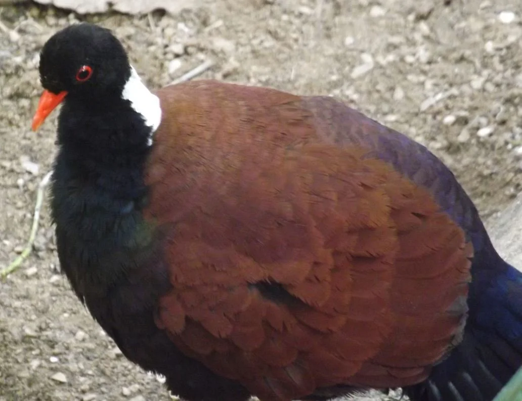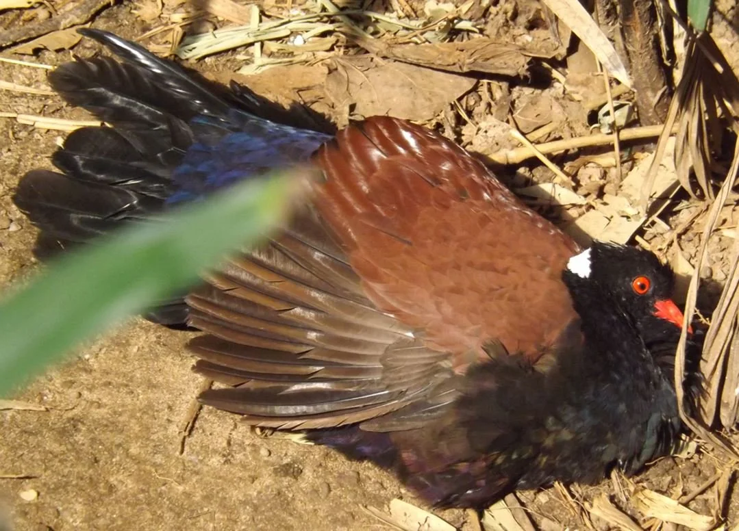 Caption: sun-bathing White-naped pheasant-pigeon, photographed at Marwell Wildlife in 2022. The bright red bill and eye are distinctive, and note the glossy nature of many of the wing and tail feathers. Image: Darren Naish.