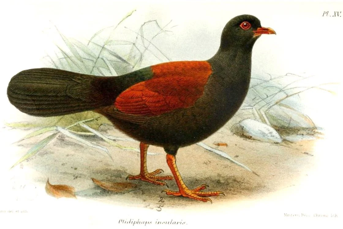 Caption: John G. Keulemans’ image of a Black-naped pheasant-pigeon in life. Image in public domain.