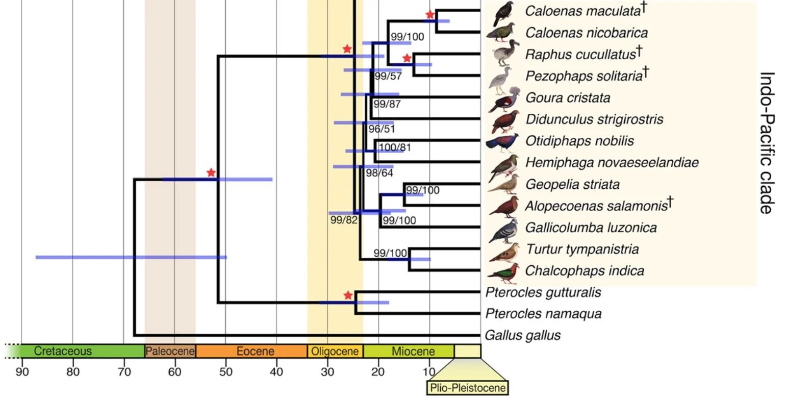 Caption: the Indo-Pacific segment from Soares et al.’s (2016) phylogeny. Pheasant-pigeons emerge as the sister-group to fruit pigeons, here represented by Kererū or New Zealand pigeon Hemiphaga novaeseelandiae. Note that virtually all of the lineages here originated deep in the Miocene.