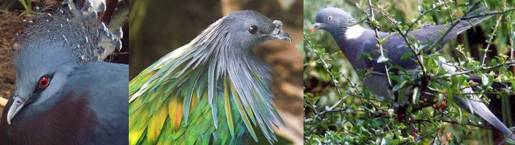 Caption: some representation of pigeon diversity. From left to right: a crowned pigeon (Goura), Nicobar pigeon (Caloenas), wood pigeon (Columba). Images: Darren Naish.