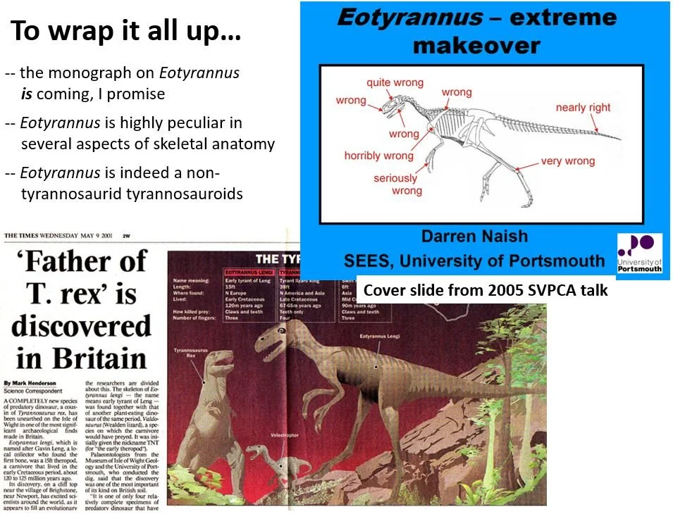 Caption: slide I used in an Eotyrannus-themed talk from 2013, which itself features a slide from a talk I gave in 2005, and promises the one-day appearance of the study that’s just appeared (Naish & Cau 2022).