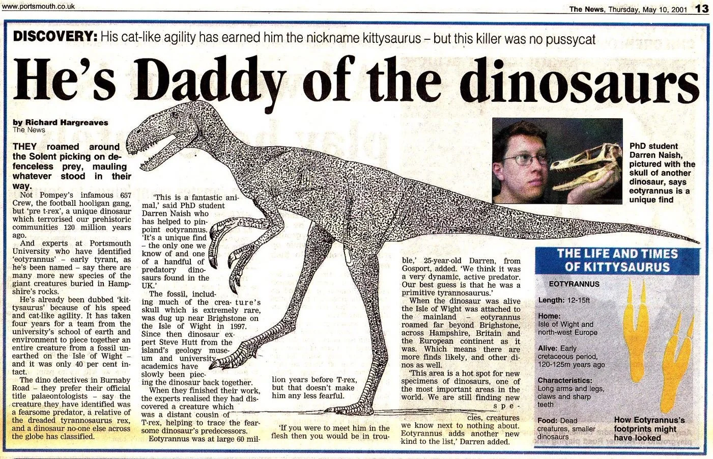 Caption: Eotyrannus goes to the press, round 2. The publication of the Cretaceous Research paper in 2001 resulted in another lot of coverage. This article – from Portsmouth’s The News newspaper – contains much weirdness, including the nomen nudum Kittysaurus.