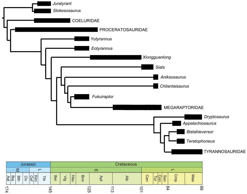 Caption: time-calibrated tyrannosauroid phylogeny from Naish & Cau (2022). We find stokesosaurs and coelurids to be early-diverging tyrannosauroids, Eotyrannus to be part of an ‘intermediate’ grade closer to tyrannosaurids than Yutyrannus, and megaraptorans to be part of Tyrannosauroidea too.