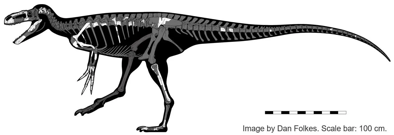 Caption: our new skeletal reconstruction of Eotyrannus lengi IWCMS: 1997.550 depicting the extrapolated appearance of the entire skeleton, with estimated soft tissue outline. The shapes and proportions of those elements unknown from Eotyrannus lengi are based on those of other non-tyrannosaurid tyrannosauroids. Image by Dan Folkes, from Naish & Cau (2022).