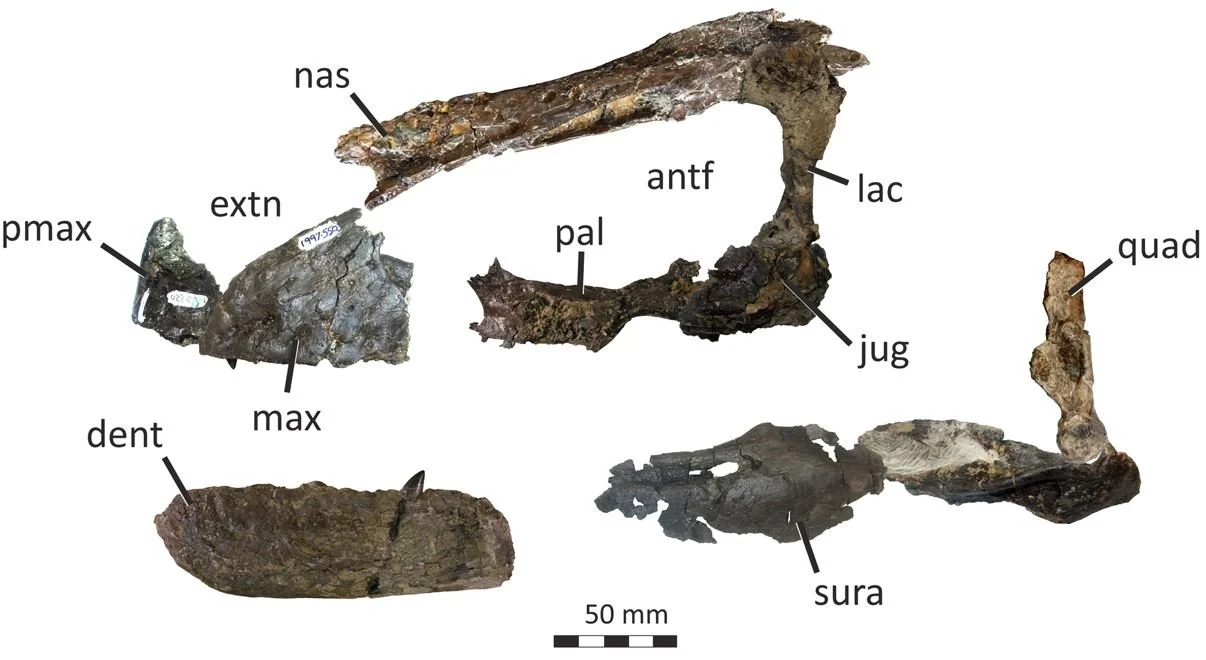 Caption: the known skull bones of Eotyrannus lengi shown in reconstructed life position, excluding isolated teeth and the possible vomer. Broken and missing areas mean that the exact nature of the articulations are unknown. Some elements (like the premaxilla) are reversed from the right side. Image: Naish & Cau (2022).