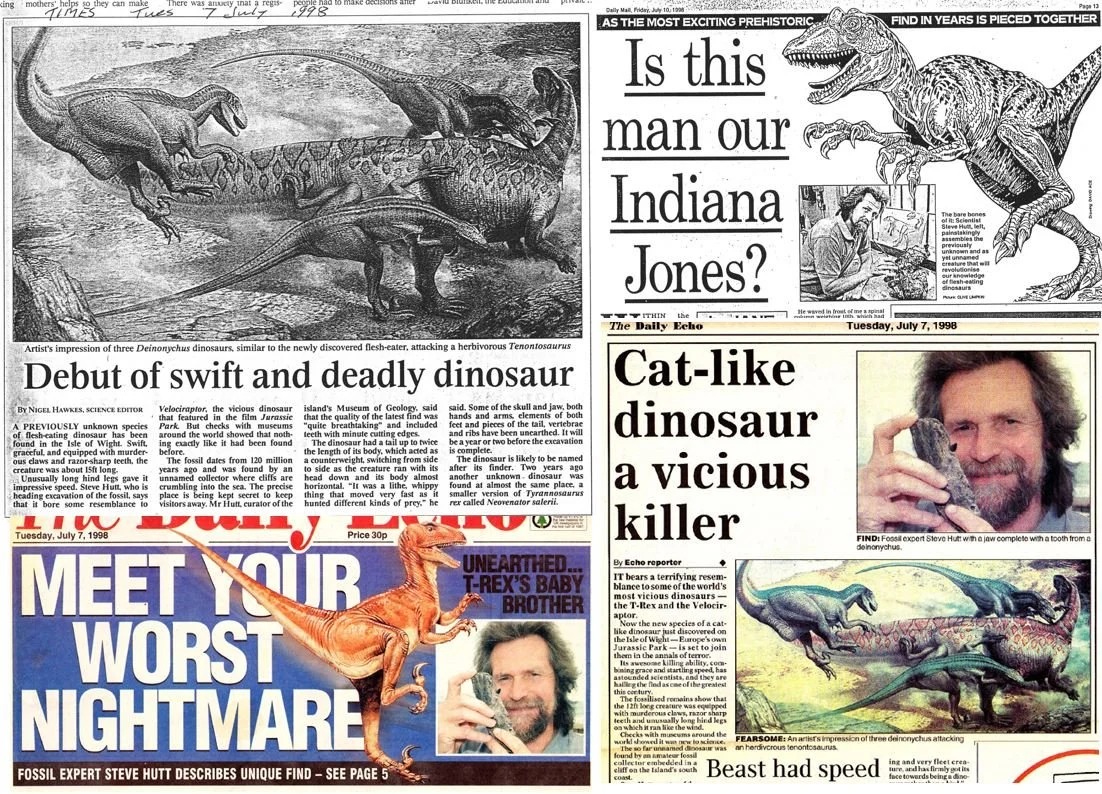 Caption: Eotyrannus goes to the press, round 1. Steve Hutt – theropod expert and Museum of Isle of Wight Geology curator – announced the discovery of Eotyrannus in 1998, and here are various of the somewhat amusing British newspaper pieces that appeared. The UK press is something else.