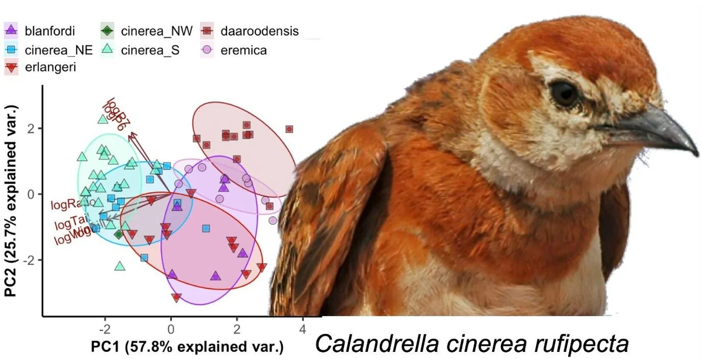 Caption: mostly gone are the days where you can just dismiss subspecies as local variants invented by people who never leave museums. Modern analyses of subspecies-level variation involve morphometrics, DNA and data on range and ecology. The new Red-capped lark subspecies C. cinerea rufipecta was named by Stervander et al. (2020).