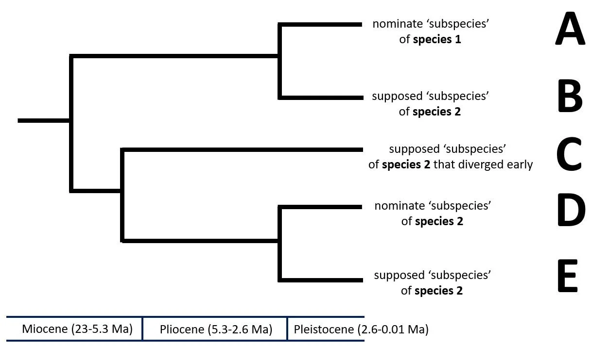 Caption: here’s a hypothetical time-calibrated cladogram that illustrates the sorts of issues we’re dealing with. How do we treat (in the taxonomic sense) taxa B, C and E? The primary assumption here is that taxa that have been separate for more than c 2 Ma are ‘different enough’ to be species. B seems here not to belong to the same species as D (as had previously been thought), so is it a new species, or is it part of the same species as A? Is C a distinct species, or is it part of the same species as D and E? And is even E ‘distinct enough’ from D to be a distinct species? After all, the two diverged in the Pliocene.
