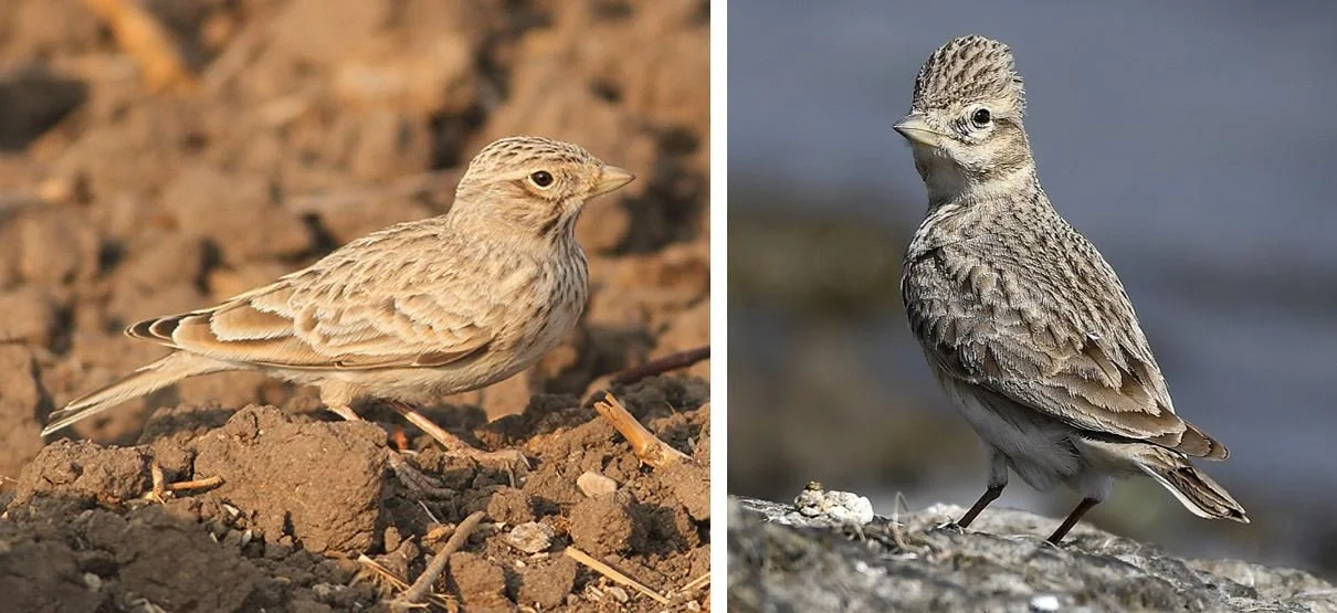 Caption: at left, a Mediterranean short-toed lark Alaudala rufescens photographed in Israel. At right, a Sand lark Al. raytal photographed in India. Genetics indicates that Al. raytal is nested within the traditional version of Al. rufescens where it’s one of five deep, distinct lineages. The solution most consistent with decisions made elsewhere in passerine taxonomy is that all five should be retained as species or elevated to species level. Larks of many sorts can raise and lower the feathers on the crown as desired, and thus end up with different profiles one moment to the next. Images: Lior Kislev, CC BY-SA 4.0 (original here); Savithri Singh, CC BY-SA 4.0 (original here).