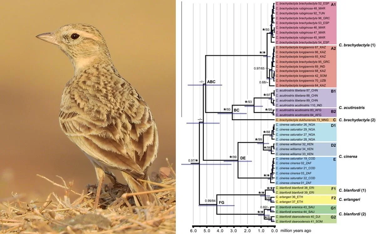 Caption: Greater short-toed lark photographed in Maharashtra, India. At right, Calandrella lark phylogeny from Stervander et al. (2016), based on mitochondrial gene b. Of note here is that some subspecies (like C. brachydactyla dukhunensis, shown in orange) don’t group with the rest of their species, and that some subspecies-level divergences (like that between C. b. dukunensis and the rest of C. brachydactyla, and those within C. blanfordi) are posited to have occurred during the Pliocene. Images: Shantanu Kuveskar, CC BY-SA 4.0 (original here); Stervander et al. (2016).