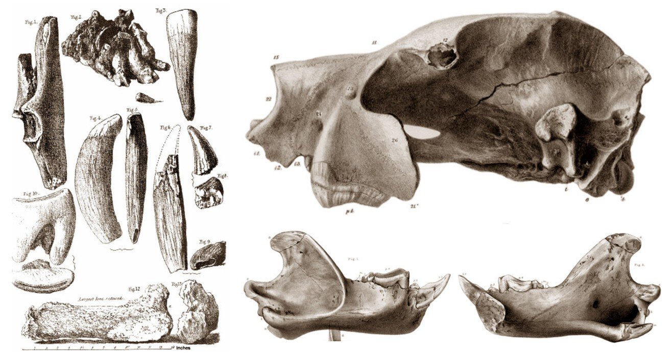 Caption: key early Thylacoleo discoveries. At left, the assortment of teeth and other fragments reported from Wellington Caves in New South Wales by Major Thomas Mitchell in 1838. At upper right, the very nice near-complete skull from Darling Downs, Queensland, lacking its zygomatic arch, described by Owen in 1866 and passed to him by Edward Hill and Daniel Cooper. At lower right, lateral (left) and medial (right) views of the right hemimandible from Wellington Caves described by Owen in 1886.