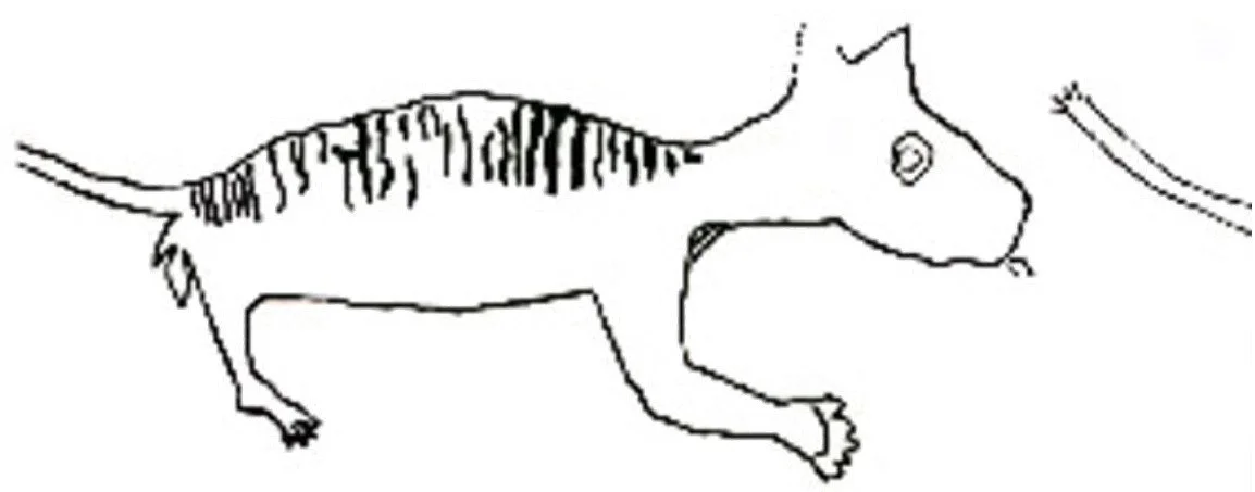 Caption: an effort to depict the rock image shown above diagrammatically… a formatting issue in the publication resulted in part of the tail being shown as separate from the rest of it, a weird error. Anyway, the stripes, pointed ears, hairs at the tail tip and genitals are obvious. Image: Akerman & Wiling (2009).