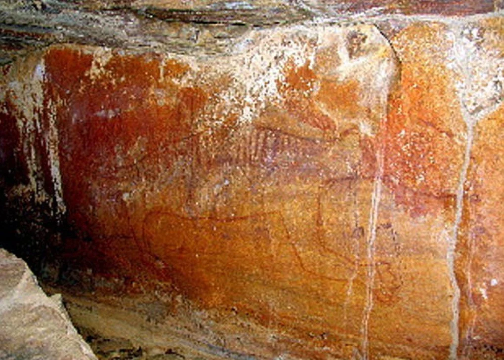 Caption: photo of the probable Thylacoleo red ochre rock art image, from the Kimberley of Western Australia, figured by Akerman & Wiling (2009). It was deliberately photographed at an angle so that the whole creation could be included. Unfortunately, the published version (the article was published in an online journal) is featured at small size and low resolution. Image: Akerman & Wiling (2009).