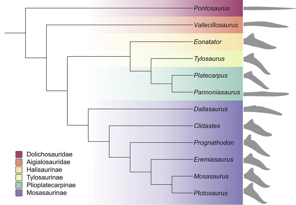 Caption: mosasauroid tail fluke anatomy plotted on a cladogram, from Song & Lindgren (2025). The distribution of these flukes (or fins) on the cladogram indicates two or more independent evolutions of the highly modified, heterocercal tail tip most obvious in tylosaurines and mosasaurines. Image: Song & Lindgren (2025).