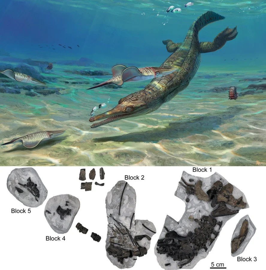 Caption: the Early Jurassic thalattosuchian Turnersuchus, an archaic member of the group outside the teleosauroid + metriorhynchoid clade. The specimen is on show at Lyme Regis Museum. Note from the scale bar that it’s not a large animal. Images: Júlia d'Oliveira; Wilberg et al. (2023).