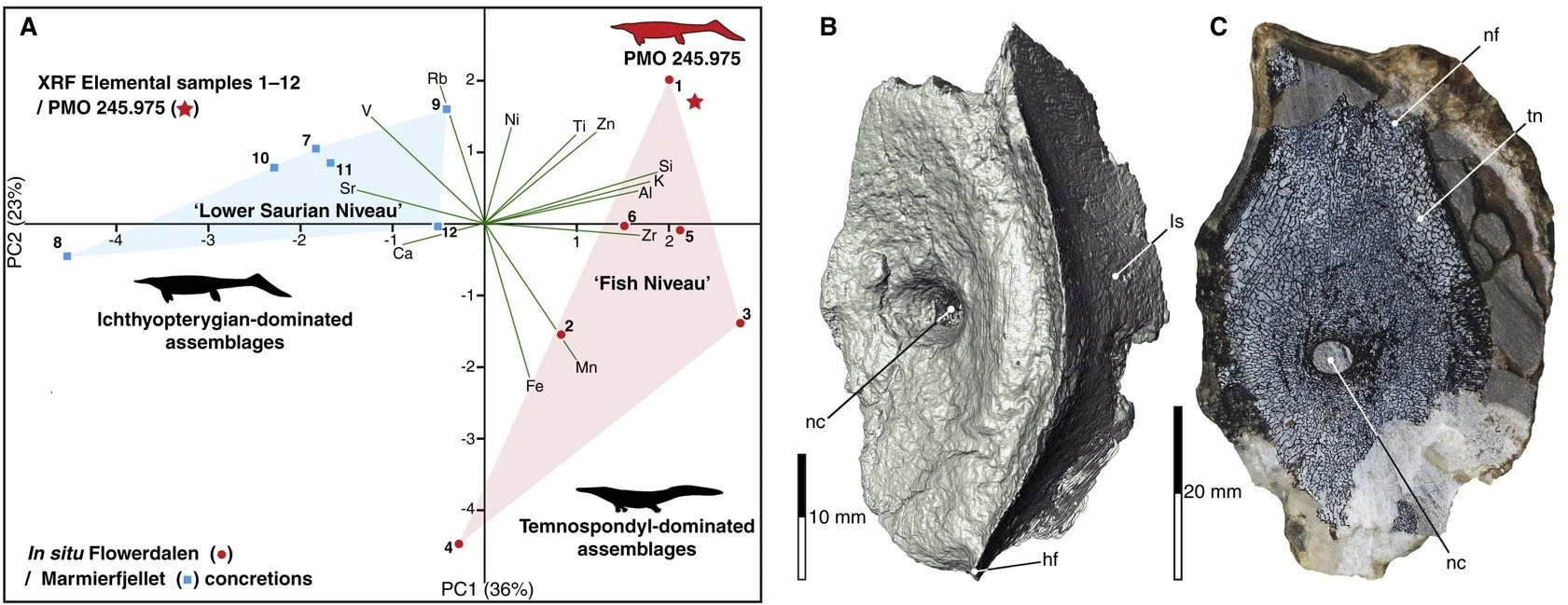 Caption: the surprisingly old Early Triassic ichthyosaur caudal vertebra PMO 245.975 from Spitsgerben, shown at right, demonstrates the presence of these animals very shortly after the giant end-Permian extinction. The plot at left shows how the specimen was demonstrated via geochemistry to belong to the ‘Fish Niveau’ and thus to have originated in-situ from this stratigraphically old unit, and not to have eroded out of a younger unit higher in the sequence. Image: Kear et al. (2023).