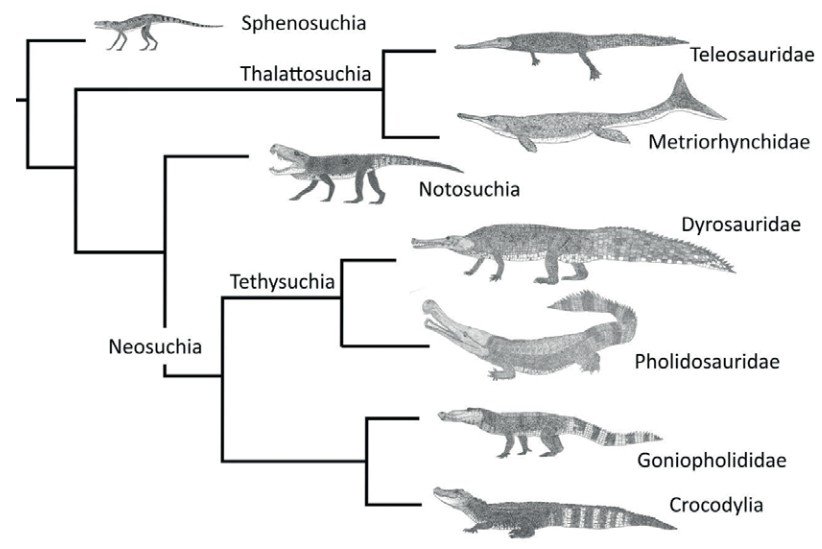 Caption: views on where thalattosuchians belong within Crocodylomorpha have undergone a major change over the past few decades. Recent studies have mostly found them to be well away from Neosuchia – the mostly Cretaceous and Cenozoic group that has extant representatives – and to instead be placed among various archaic lineages that are both obscure and poorly known in terms of their early history. Image: Darren Naish.