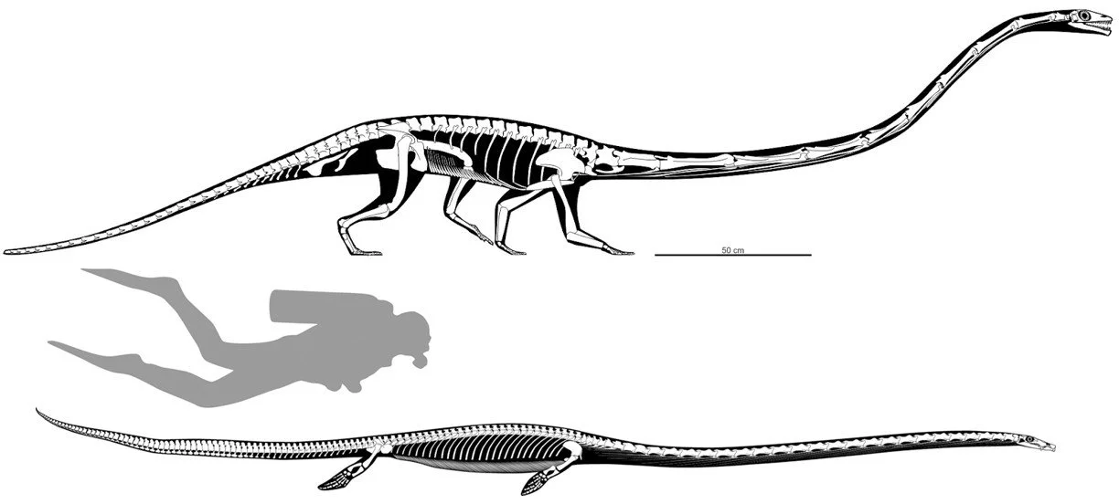 Caption: the two most famous tanysaurians. Tanystropheus is above, here shown as a digitigrade animal well adapted for terrestrial walking; Dinocephalosaurus is below, reconstructed as a highly aquatic swimmer with flipper-like limbs. The radically different ways in which members of both lineages evolved their incredibly long necks are obvious. Images: (c) Mark Witton; Spiekman et al. (2024a).