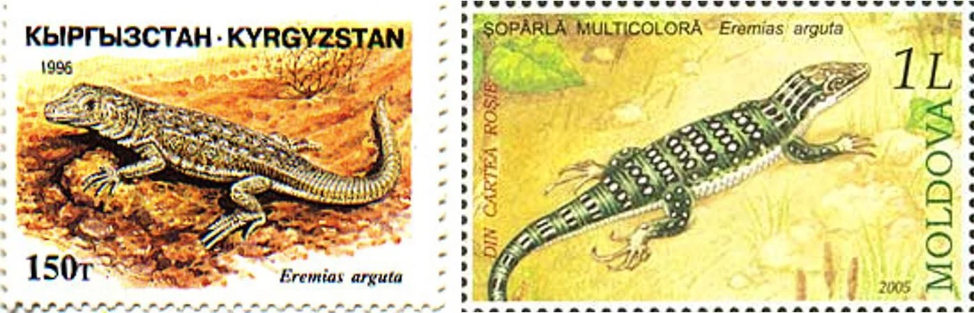 Caption: racerunners as geopolitical icons. Steppe-runners E. arguta on stamps produced by Kyrgyzstan and Moldova. Unfortunately, I only have these images at low resolution, sorry. Images in public domain.