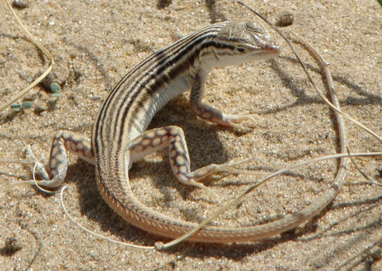 Given the short lifespan of the Rapid fringe-toed lizard, I’m also surprised to find that it apparently only produces 2-5 eggs per year: you’d expect greater fecundity in such a small, short-lived animal. Juvenile racerunners often differ substantially from adults in colouration. This is a fairly common thing for lacertids and might be an evolutionary response to the different predation pressures that affect these animals at different points in their lives. Minor sexual dimorphism is present, with males having proportionally larger heads than females (Li et al. 2006) and, in some species, more prominent spots and stripes (Moravec 1994). However, the heads of males are apparently no broader than those of females (though they are longer) in Mongolian racerunners or Ordos racerunners E. brenchleyi, perhaps because head width is constrained in those species by its role in sand-burrowing, nor are males larger or longer overall (Kim et al. 2010).