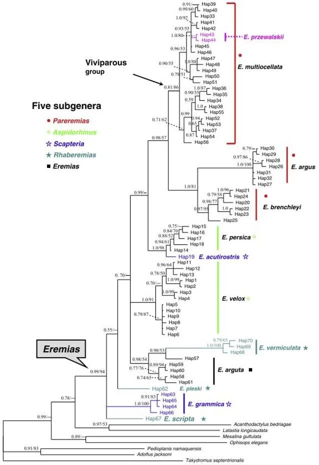 Caption: phylogeny for Eremias generated by Guo et al. (2011). Some of Szczerbak's ‘subgenera’ corresponded to clades but others did not.