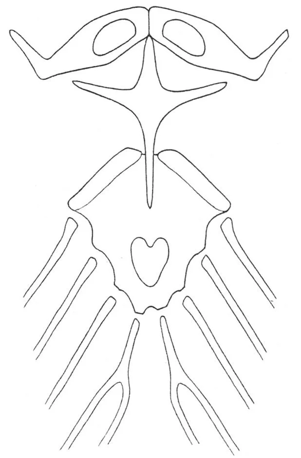 Caption: sternum, sternal ribs, interclavicle and clavicles of Acanthodactylus (from Arnold 1989). Note the heart-shaped sternal fontanelle (other lacertids have round fontanelles). I wonder why these lizards have sternal fontanelles in the first place? Image: Arnold (1989).