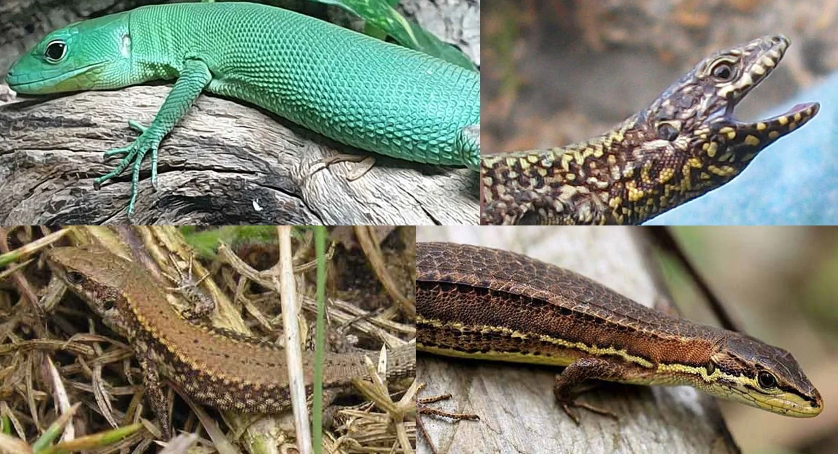 Caption: my location in western Europe means that Lacertidae is the lizard group whose species I’ve encountered most frequently, and here’s a lacertid montage. Clockwise from upper left: the African eremiadin Gastropholis, the European lacertin Podarcis, the Asian lacertin Takydromus, and the European lacertin Zootoca. Images: Darren naish; Takydromus (lower right) by TANAKA Juuyoh, CC 2.0 (original here).