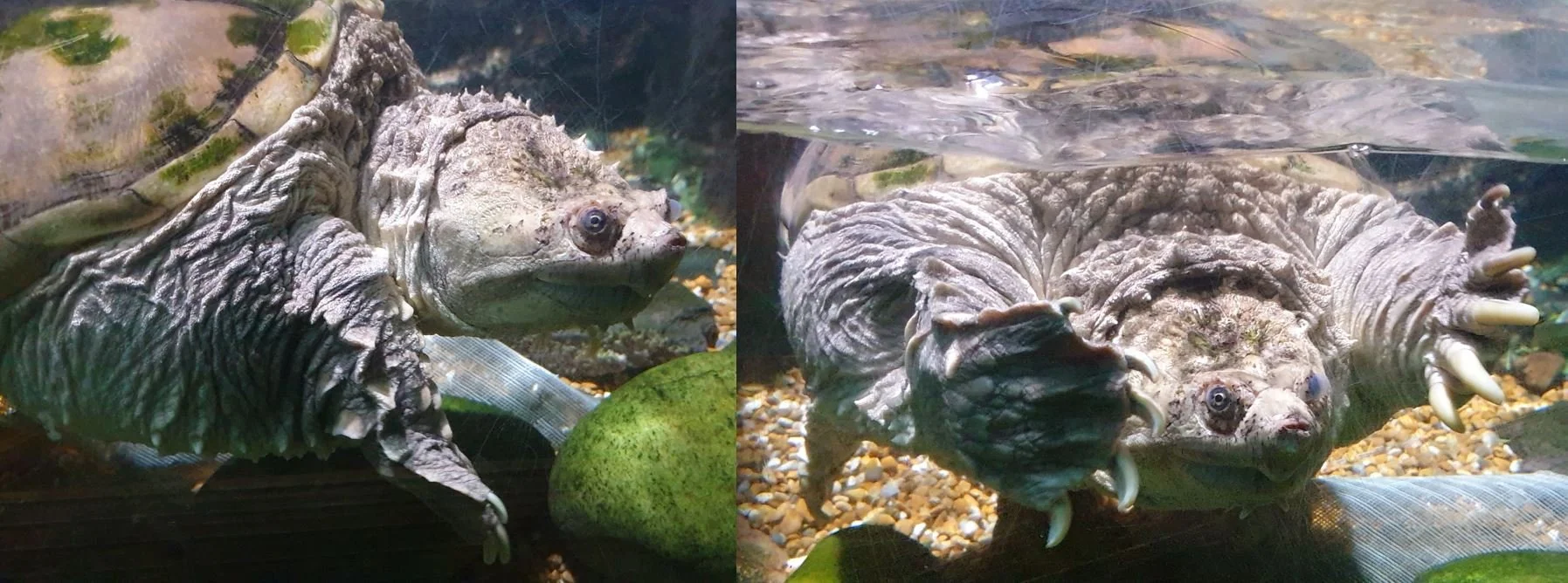 Caption: an unusually pale Common snapping turtle on show at Bluereef Aquarium, Portsmouth, UK. Images: Darren Naish.