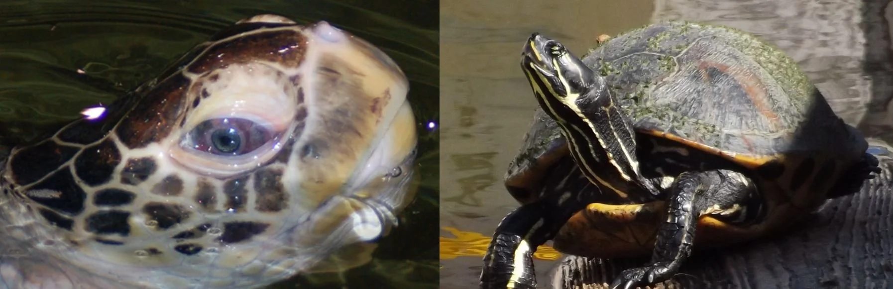 Caption: I sometimes consider it kinda odd that a group of reptiles built the way they are have been so strongly associated with amphibious and aquatic habits across their history, but here we are. At left, an unusual close-up view of a captive Green turtle Chelonia mydas. At right, a Pseudemys turtle (maybe a Florida red-bellied P. nelsoni?) observed in the wild in Florida, in a swimming pool of all places. Images: Dave Hone, used with permission; Darren Naish.