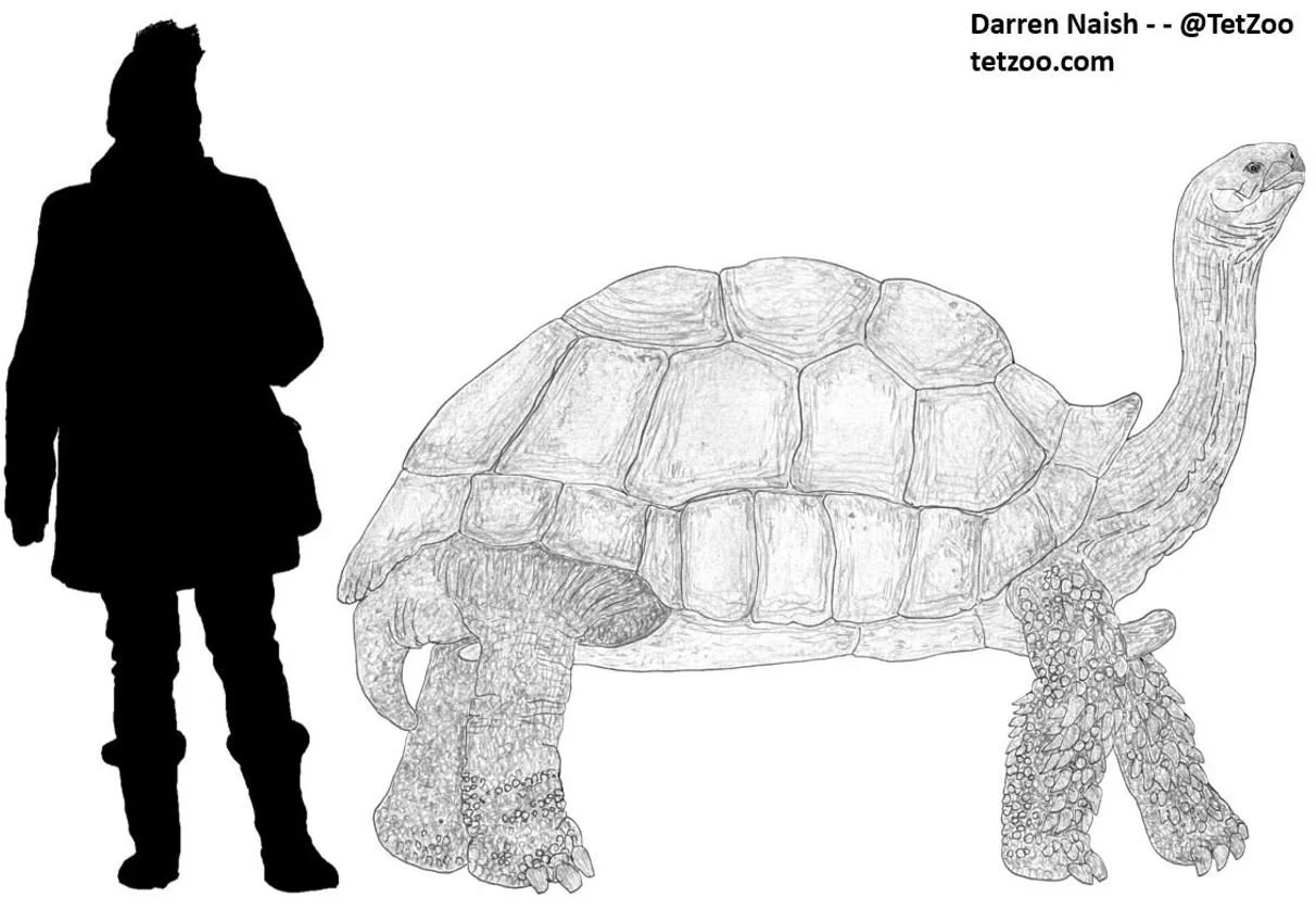 Caption: Megalochelys, a giant tortoise of prehistoric Eurasia, included giant specimens where the CCL (curved carapace length) was 2 m long. Here, I’ve followed the long tradition of showing this animal to scale with a modern human: the one used here has a standing height (without hat) of 1.6 m. Image: Darren Naish.