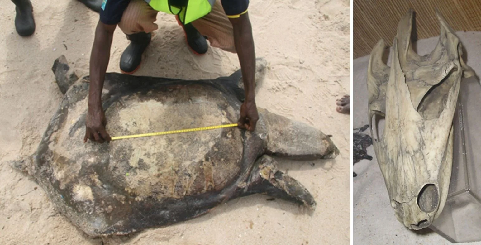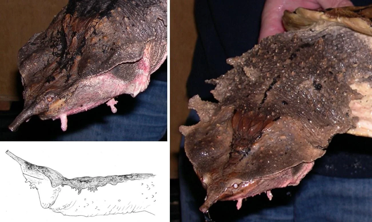 Caption: at left, a surprisingly big African softshell Trionyx triunguis photographed at the mouth of the Congo River; this is one of a series of photos shared in 2009 at the SA Reptiles discussion board. At right, skull of an Indian narrow-headed softshell Chitra indica, another large member of the group. Note how elongate and (yes) narrow that skull is, and how the orbits are aaaaaalll the way at the front. Images: © Herphabitat (originals here); Darren Naish.