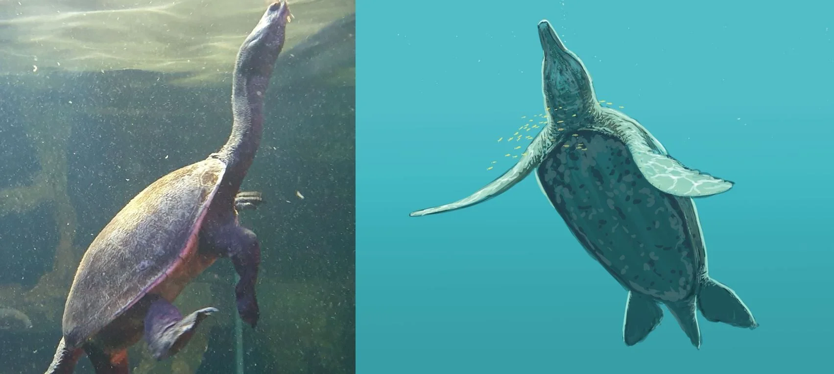 Caption: aquatic turtles at very different ends of the size spectrum. At left, a pleurodire, specifically a Roti Island snake-necked turtle Chelodina mccordi observed at Brighton Aquarium (sorry the snout is cut off: these animals move far too much to enable nice, clear photos). At right, a reconstruction of the gigantic Late Cretaceous North African sea turtle Ocepechelon. Images: Darren Naish; Joschua Knüppe.