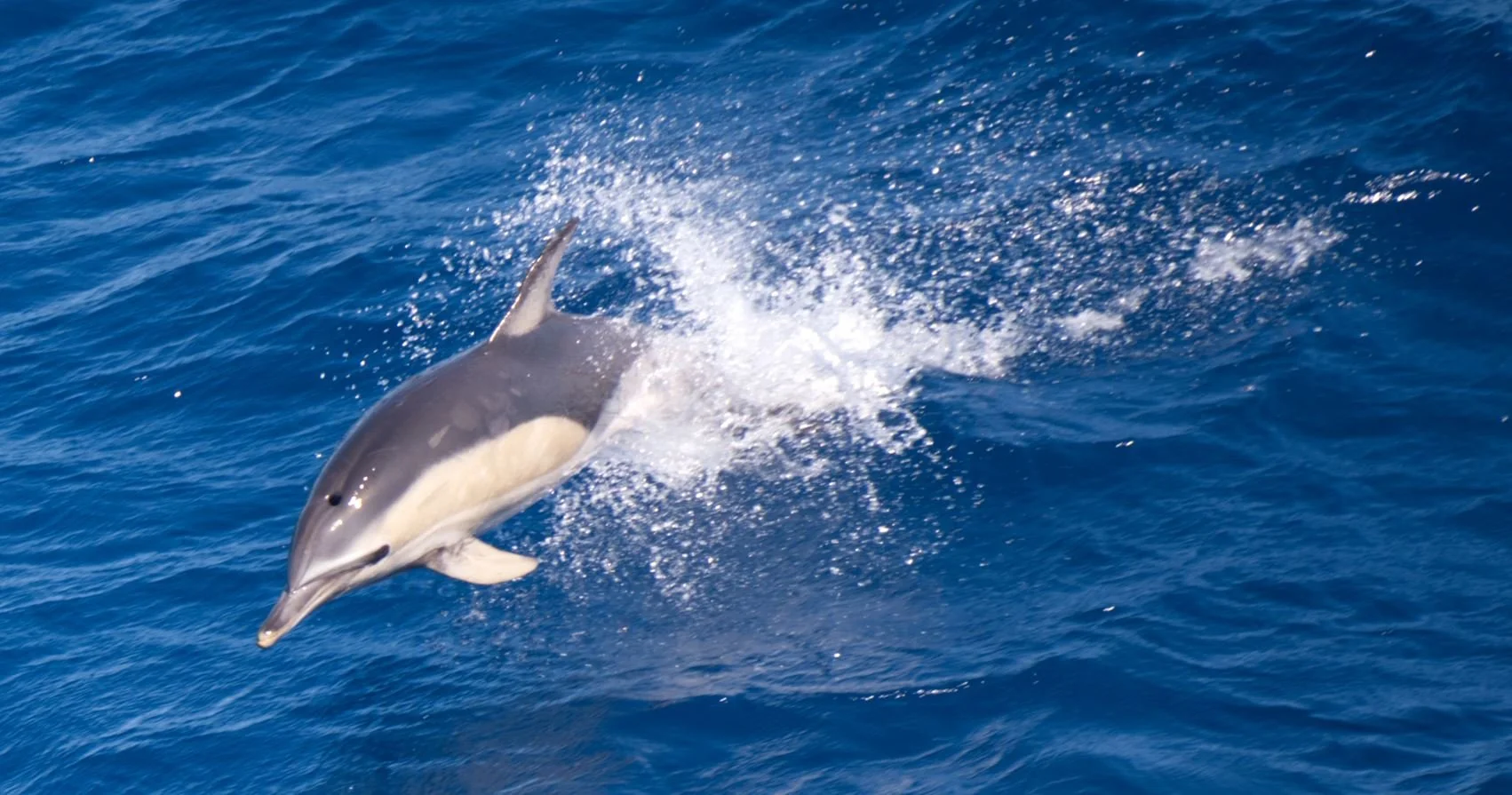 Caption: leaping Common dolphin. This species is highly variable in pattern and colour (and there’s ecomorphological variety in beak length as well); this one is interesting in having irregular pale patches on its dorsal cape. Image: Alex Srdic.