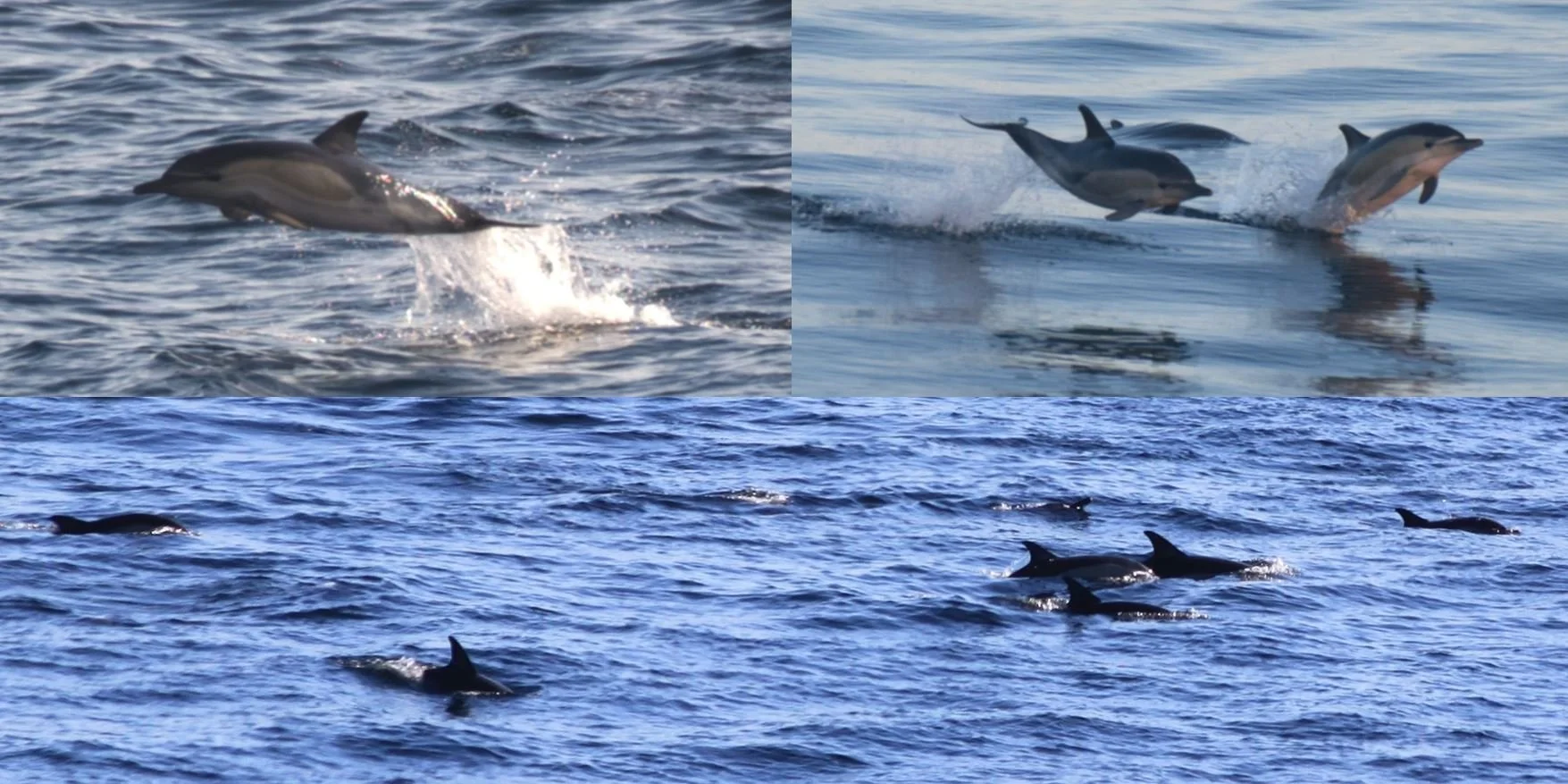 Caption: a Common dolphin montage, showing individuals leaping as well as a family group moving at a more sedate pace. Images: Alex Srdic; lower one Darren Naish.