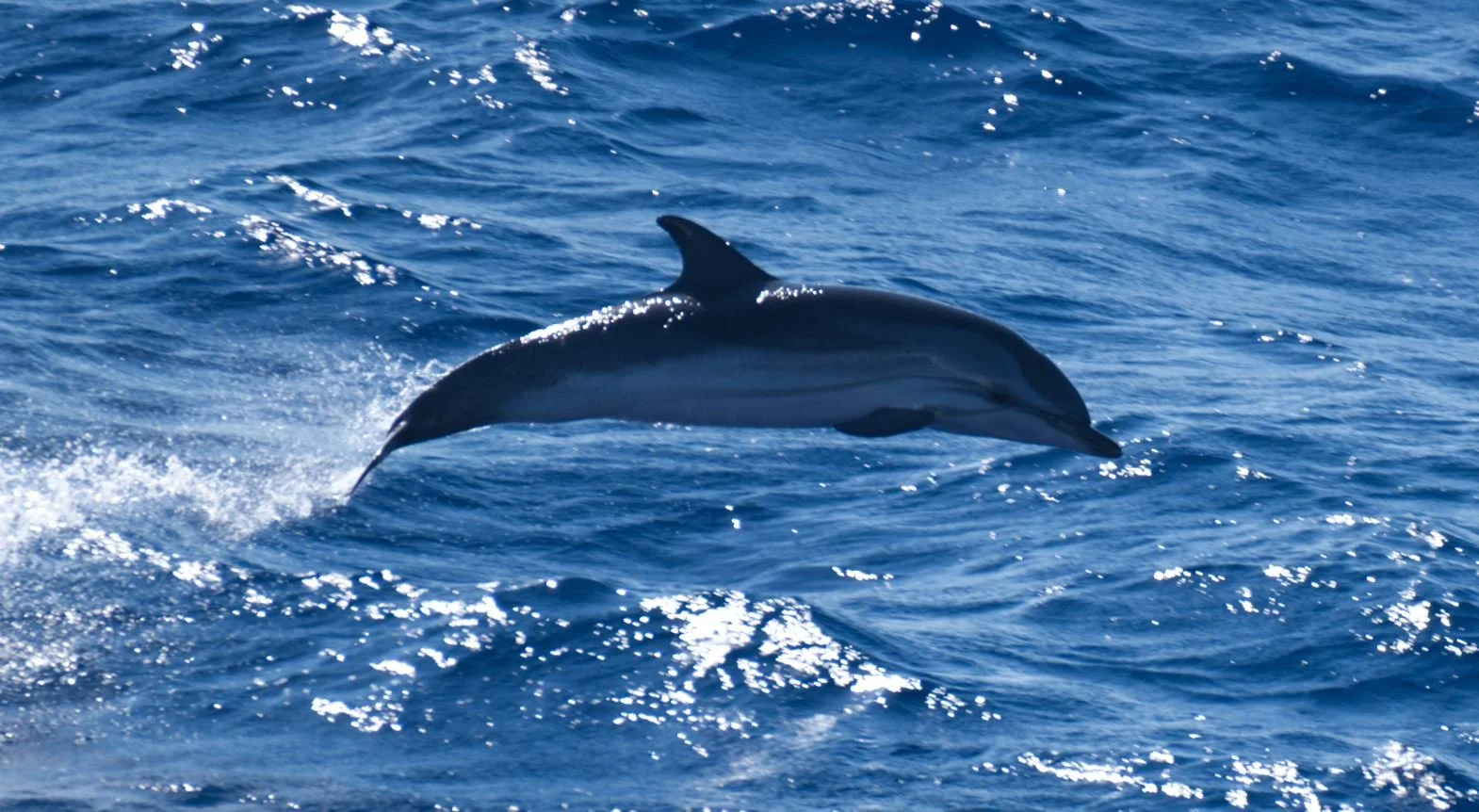 Caption: leaping Striped dolphin showing eponymous markings. Image: Alex Srdic.