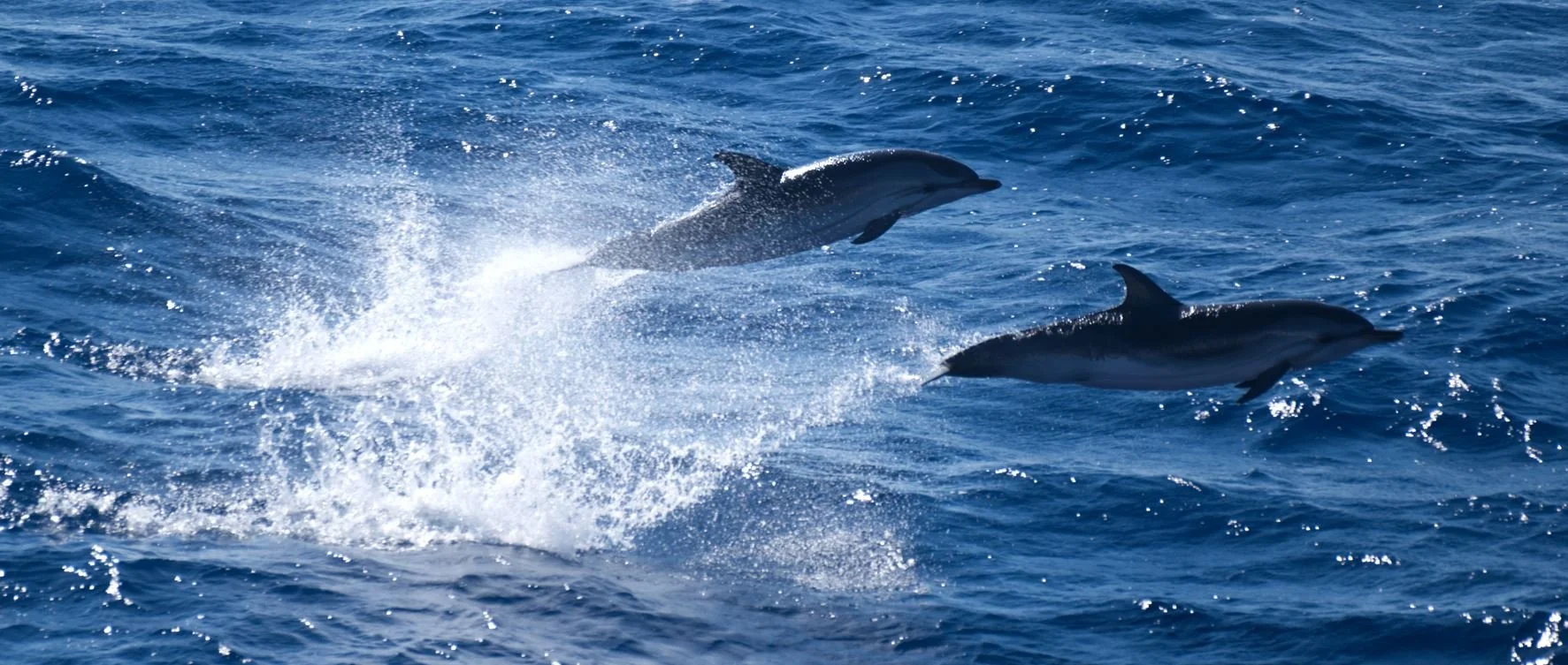 Caption: a pair of leaping Striped dolphins. Spray and very visible splashing is typical of Striped dolphin leaps. Image: Alex Srdic.