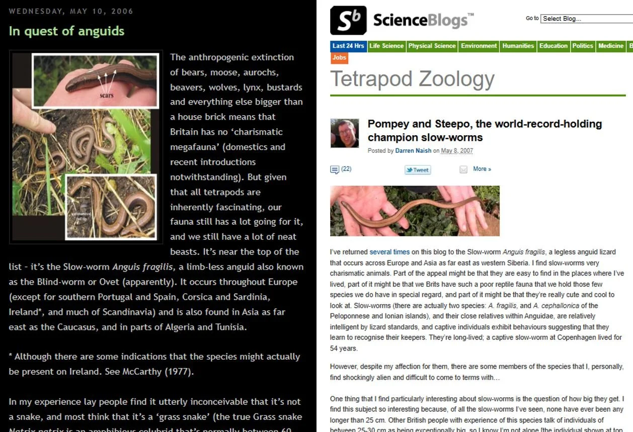 Caption: I had the impression that slow-worms have been covered on an unusually high number of occasions here, but it turns out that I’ve only written about them three times or so. Given that Tet Zoo is approaching its 20th year of operation, it shouldn’t be surprising that certain familiar species have been covered more than once. These two articles are from ver 1 (2006) and 2 (2007), respectively.