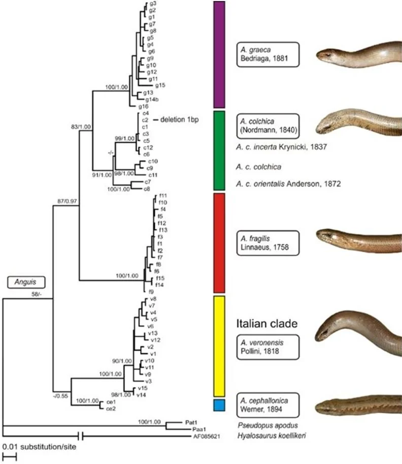Gvoždík, V., Benkovský, N., Crottini, A., Bellati, A., Moravec, J. Romano, A., Sacchi, R. & Jandzik, D. 2013. An ancient lineage of slow worms, genus Anguis (Squamata: Anguidae), survived in the Italian Peninsula. Molecular Phylogenetics and Evolution 69, 1077-1092.