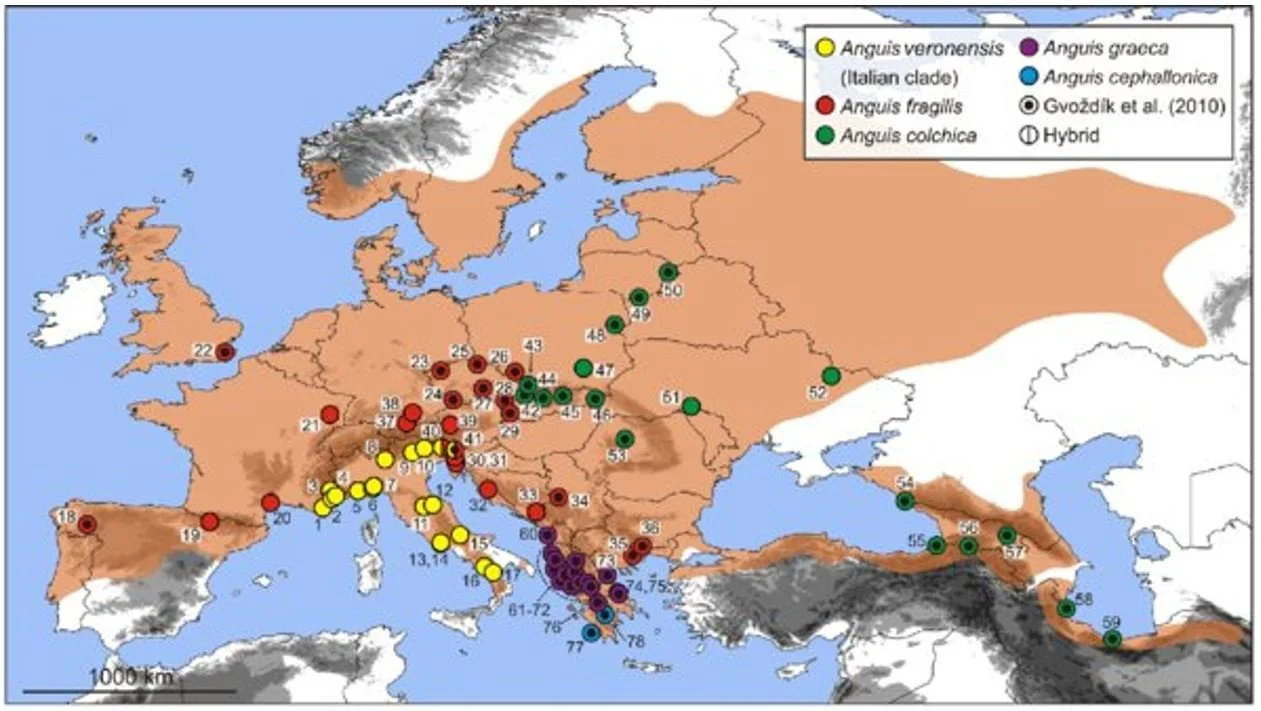 However, 21st century molecular studies have led to the recognition of divergences within this group that occurred way back… as in, during the Miocene (so, around 25 million years ago or more). Lineages that old, in tetrapods, are surely separate species, and these discoveries are mostly responsible for the view that multiple species are present, hence the recent recognition of the Eastern slow-worm A. colchica of Russia and Georgia, Greek slow-worm A. graeca and Italian slow-worm A. veronensis (Gvoždík et al. 2010, 2013). Thus, we now have five extant slow-worm species. Populations from the more eastern part of slow-worm range are relatively understudied, so it’s possible that east Eurasian animals currently labelled as A. fragilis might turn out to be something else, but let’s just see.