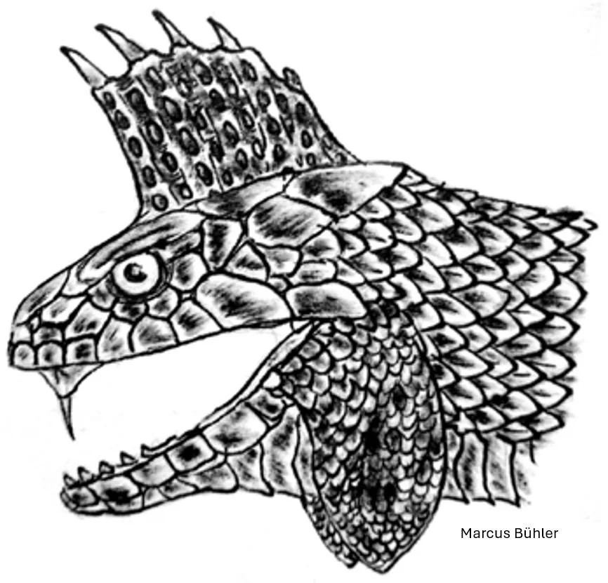 There’s also a case from 1959 where John Knott was driving through the Kariba area of Zimbabwe (then Southern Rhodesia) when he ran over and mortally wounded a large, jet-black snake about 1.8 m long. It possessed a distinct, symmetrical head crest that possessed five internal prop-like struts. Seemingly, these allowed the crest to be raised at will (Shuker 1991). Shuker noted how the ‘struts’ sounded reminiscent of the rods that help the Frill-necked lizard Chlamydosaurus kingii erect its neckfrill, but we don’t know what became of this snake, nor did Knott illustrate or photograph it.
