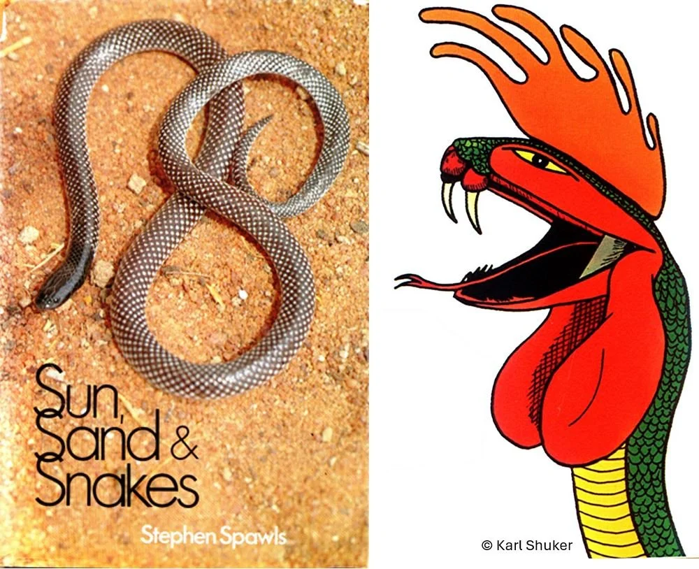 Caption: at left, cover of the 1979 Sun, Sand & Snakes, a valuable source of info on the Crowing crested cobra and African snakes in general. At right, reconstruction of Crowing crested cobra by Karl Shuker, used with permission.