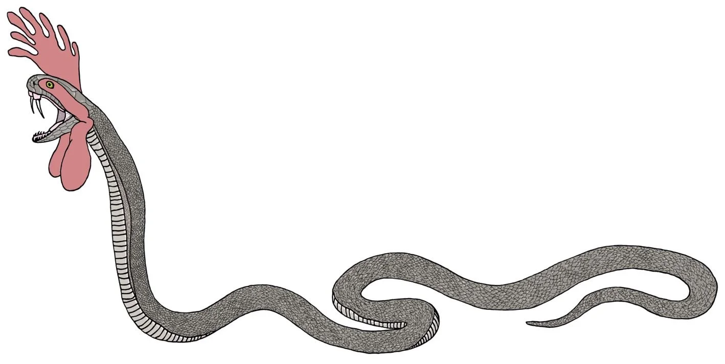 Caption: a speculative effort to reconstruct the Crowing crested cobra as if it were a real elapid snake, with the sort of cephalic scalation expected for cobras and their kin. Image: Marcus Bühler, used with permission.