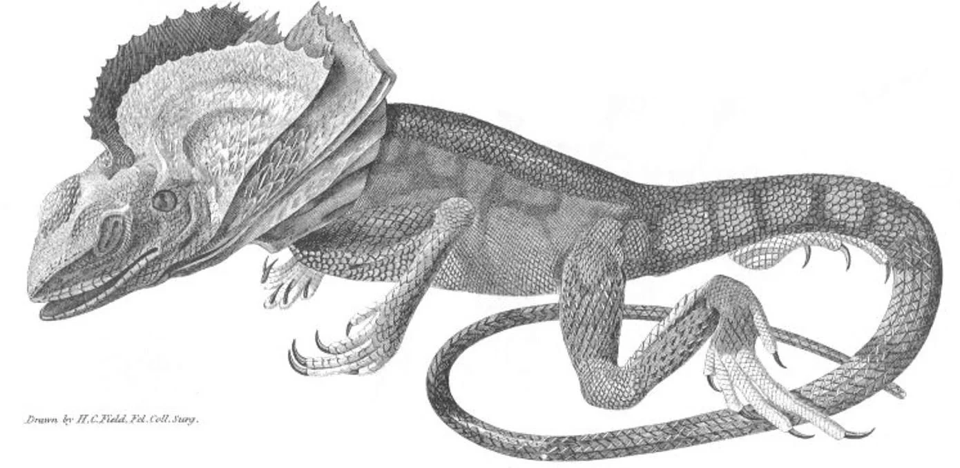Caption: vintage 1827 illustration of deceased Frill-necked lizard, published in Phillip Parker King’s Narrative of a Survey Volume 2, the first outing of this species in the scientific literature and the place where it was officially named and described. The illustration (an engraving) is by Mr Curtis and was based on a drawing by H. C. Field… I assume the ‘Mr Curtis’ is John Curtis (1791-1862). Image in public domain.