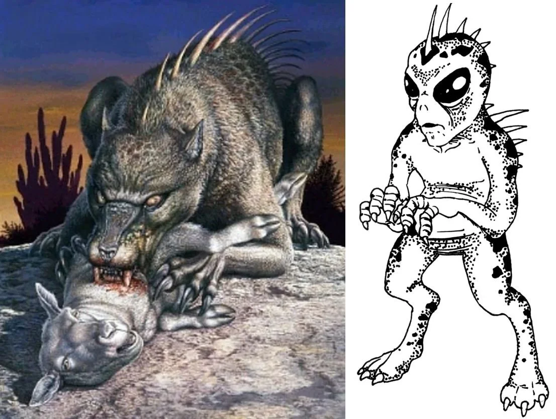 Caption: the chupacabra/chupacabras has a complex history, and what it’s imagined to be like has changed substantially over the years. Prior to it being thought of as a hairless, dog-like animal, it was supposed to be a spiky-backed vampiric humanoid, possibly of alien origin, as shown in the image at right. The illustration at left, by famed palaeoartist John Sibbick, was done for the cover of Fortean Times and reflects an effort by the artist to ‘rationalize’ the entity (rather than show it in the manner that would have been more accurate according to canon). Images: © John Sibbick / Fortean Times; LeCire (original here), public domain.